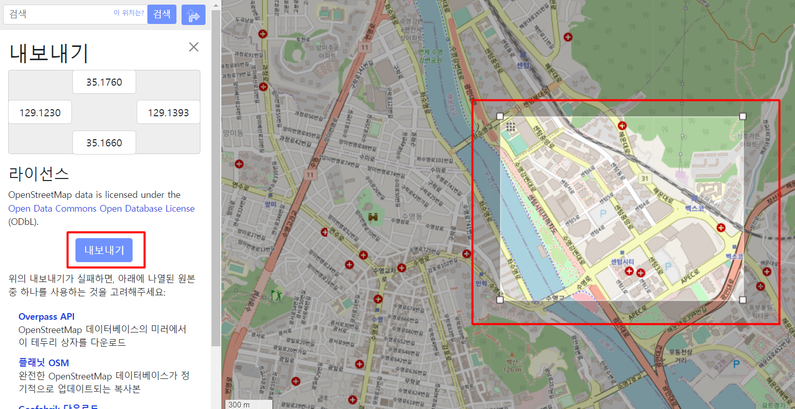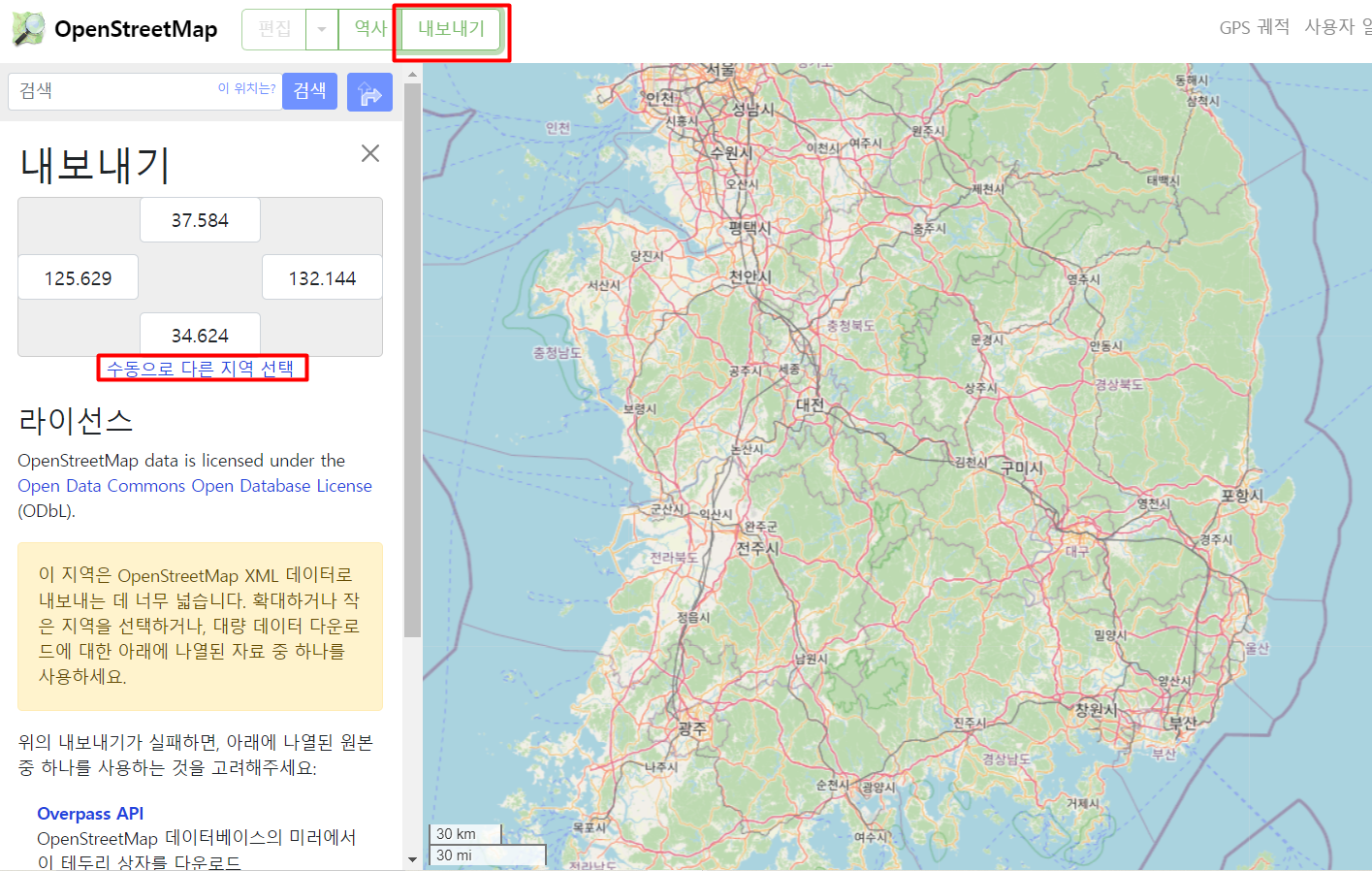 (지도 데이터를 얻고 싶은 지역으로 이동한 후 내보내기 하는 것을 추천한다.)