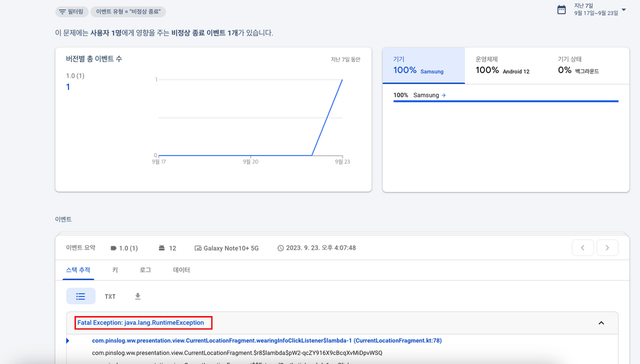 제대로 오류 로그가 수집되는지 확인하기 위해 버튼을 누르면 RuntimeException이 일어나도록 해두었다.