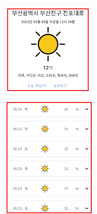 상단에는 현재 온도, 현재 시간, 옷 차림 정보, 날씨 아이콘 ID, 날씨 설명 데이터가 필요하다.
