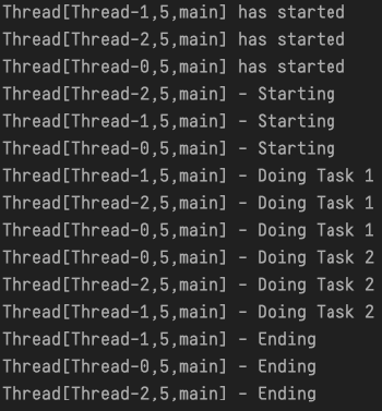 fun main() { val states = arrayOf("Starting", "Doing Task 1", "Doing Task 2", "Ending") repeat(3) { Thread { println("${Thread.currentThread()} has started") for (i in states) { println("${Thread.currentThread()} - $i") Thread.sleep(50) } }.start() } }결과