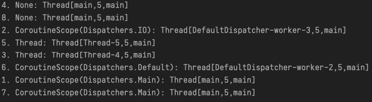 CoroutineScope(Dispatchers.Main).launch { Log.d(TAG, "1. CoroutineScope(Dispatchers.Main): ${Thread.currentThread()}") } CoroutineScope(Dispatchers.IO).launch { Log.d(TAG, "2. CoroutineScope(Dispatchers.IO): ${Thread.currentThread()}") } Thread(Runnable { Log.d(TAG, "3. Thread: ${Thread.currentThread()}") }).start() Log.d(TAG, "4. None: ${Thread.currentThread()}") Thread(Runnable { Log.d(TAG, "5. Thread: ${Thread.currentThread()}") }).start() CoroutineScope(Dispatchers.Default).launch { Log.d(TAG, "6. CoroutineScope(Dispatchers.Default): ${Thread.currentThread()}") } CoroutineScope(Dispatchers.Main).launch { Log.d(TAG, "7. CoroutineScope(Dispatchers.Main): ${Thread.currentThread()}") } Log.d(TAG, "8. None: ${Thread.currentThread()}")
