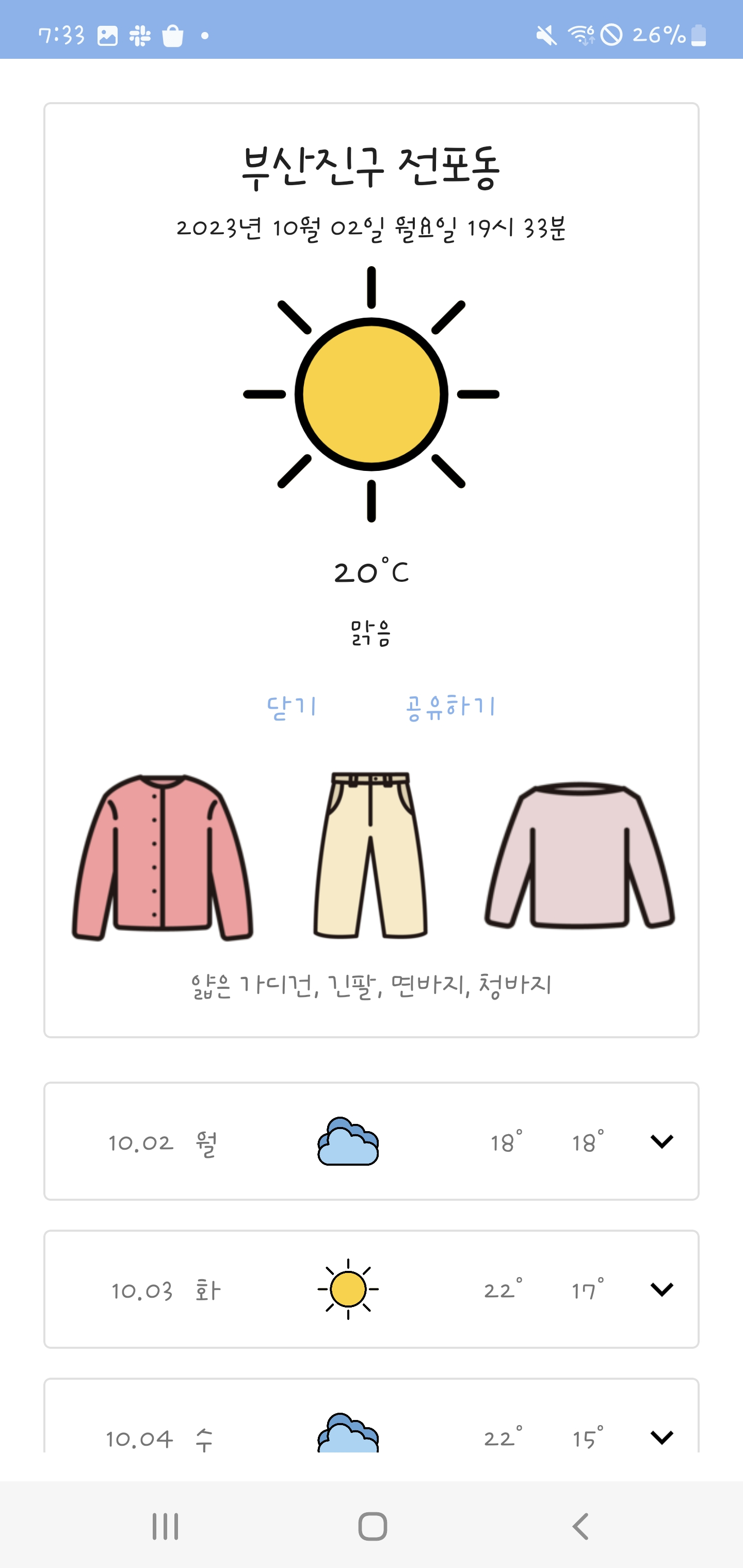 현재 위치의 현재 날씨와 이에 맞는 옷차림을 확인할 수 있다.