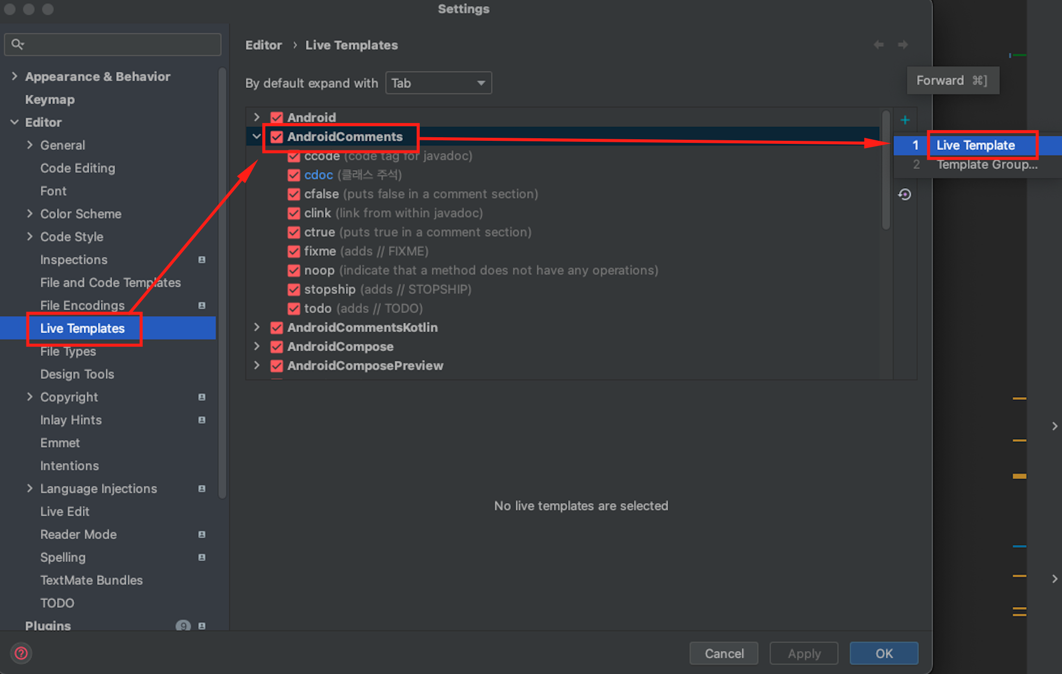 안드로이드 스튜디오 설정 > Live Template > + 버튼 클릭 > Live Template 선택