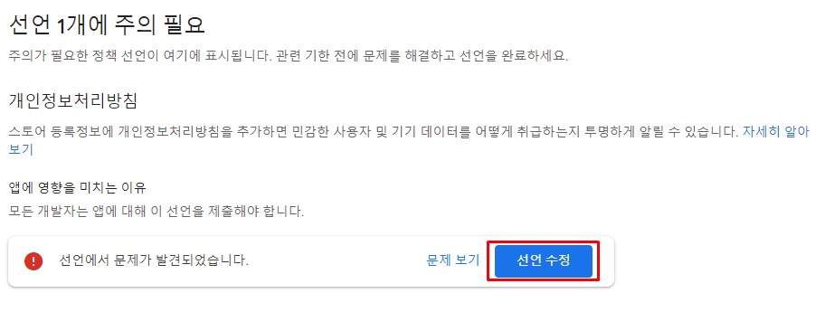 플레이 콘솔 > 좌측 메뉴 정책 및 프로그램 > 앱 콘텐츠여기서 선언수정을 눌러 URL을 변경해준다.