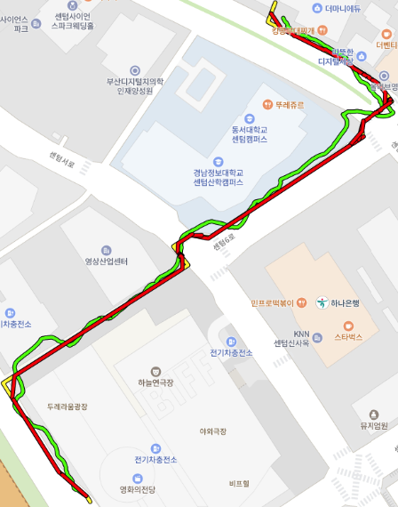 (노란색 : 경로 / 초록색 : 실제 GPS / 빨간색 : 보정 결과)기존 알고리즘 수정된 알고리즘