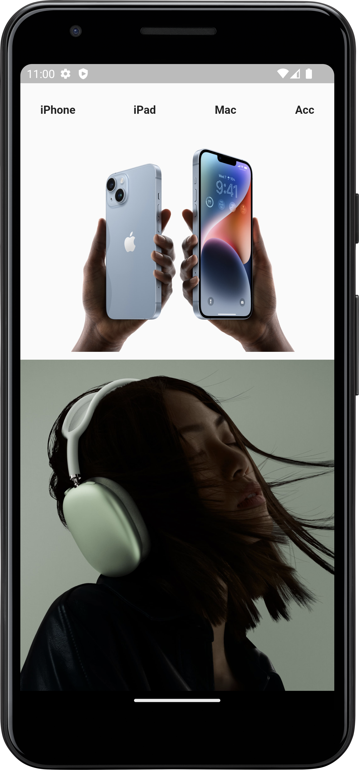 class StorePage extends StatelessWidget { const StorePage({Key? key}) : super(key: key); @override Widget build(BuildContext context) { return Scaffold( body: SafeArea( child: Column( children: [ Padding( padding: const EdgeInsets.all(25.0), // 모든 영역에 25만큼 여백을 주겠음 child: Row( children: const [ Text( "iPhone", style: TextStyle(fontWeight: FontWeight.bold), ), Spacer(), Text( "iPad", style: TextStyle(fontWeight: FontWeight.bold), ), Spacer(), Text( "Mac", style: TextStyle(fontWeight: FontWeight.bold), ), Spacer(), Text( "Acc", style: TextStyle(fontWeight: FontWeight.bold), ) ], ), ), Expanded( flex: 1, child: Image.asset( "assets/img_sample.jpg", fit: BoxFit.cover, )), SizedBox( height: 10, ), Image.asset( "assets/img_sample_max.jpeg", ) // 이름있는 생성자 ], ), ), ); } }- Column