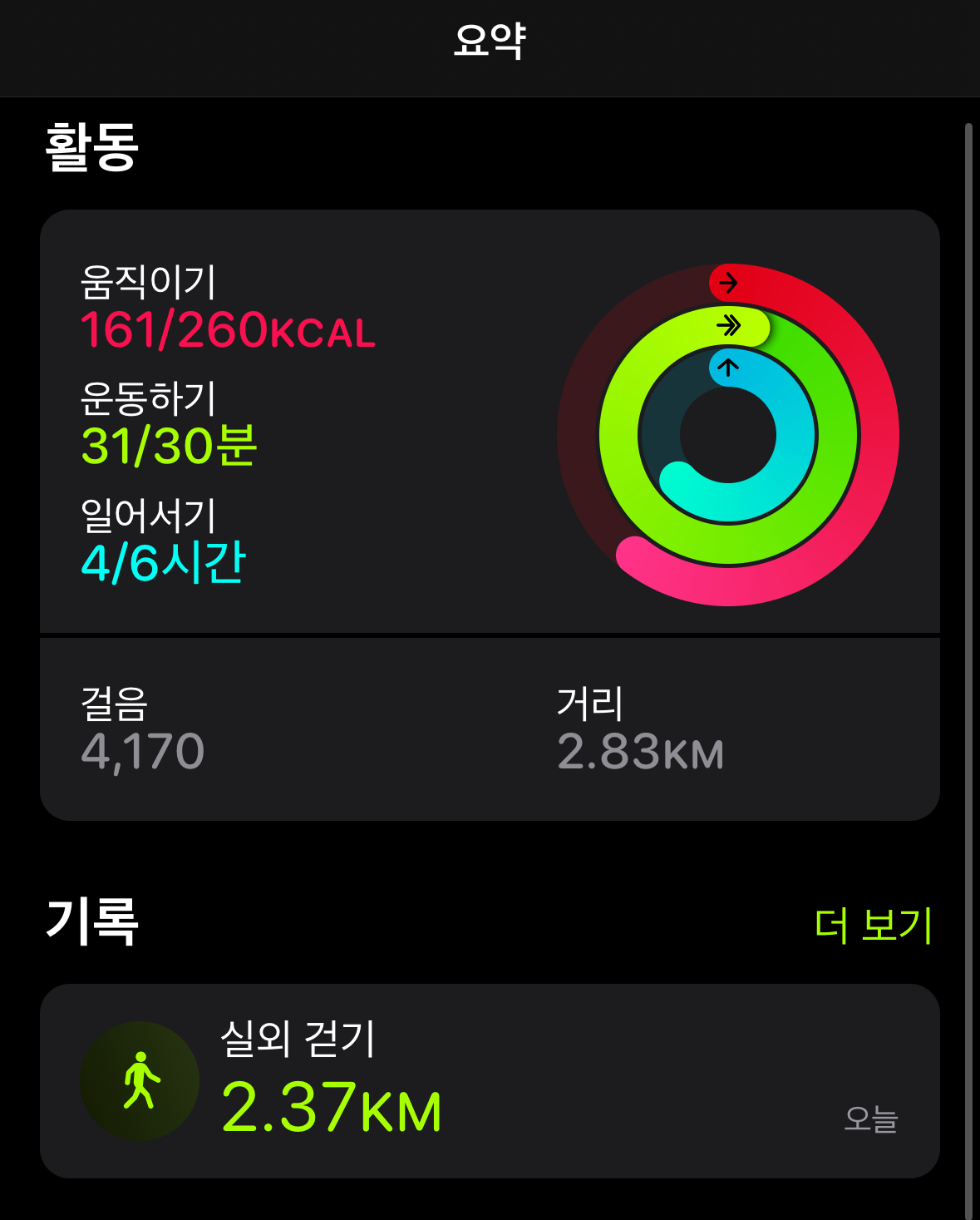 한시간 가까이 걸었는데 애플워치는 삼십분만 운동했다고 한다..