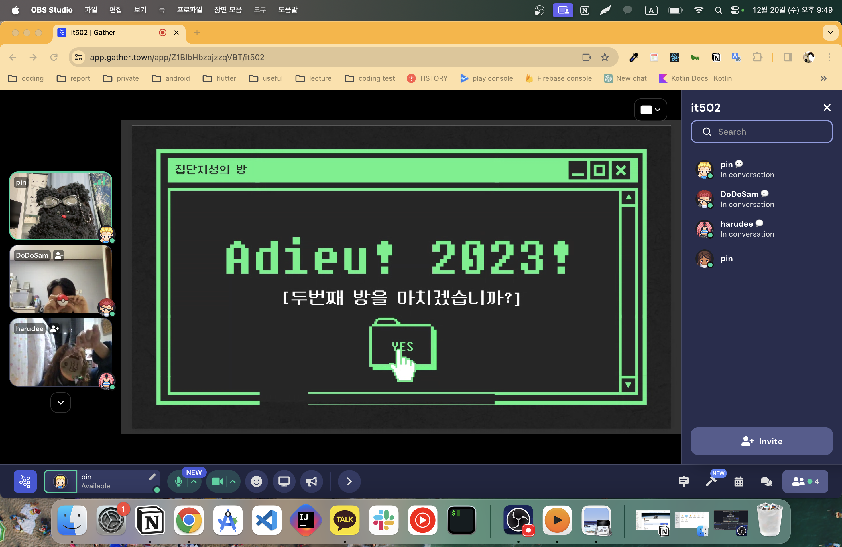 루디 : 저는 올해 저희가 스터디에 집중을 못하고 맨날 넘긴거 같아서 우리 스터디 방향이 어디로 가는가에 대한 고민을 했습니다. 근데 작년에 송년회 한 영상 보면서 두번째 집지방을 마친것을 보니 조금 건너 뛰어도 끝까지 한 것이 중요하지 않나 싶습니다. 너무 신기해요. 너무 많이 건너뛰어서 이러다 사라지면 어떡하지 걱정했는데 이걸 보니 세번째 송년회도 할 수 있을 것 같아서 힘이 났습니다. 도삼 말대로 개발자로 오래오래 남았으면 좋겠습니다. 내년에는 조금 더 개발자스러운 것을 하면 좋겠습니다.