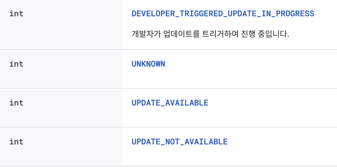업데이트가 가능한지에 대한 여부를 확인할 수 있다. → UpdateAvailability.UPDATE_AVAILABLE