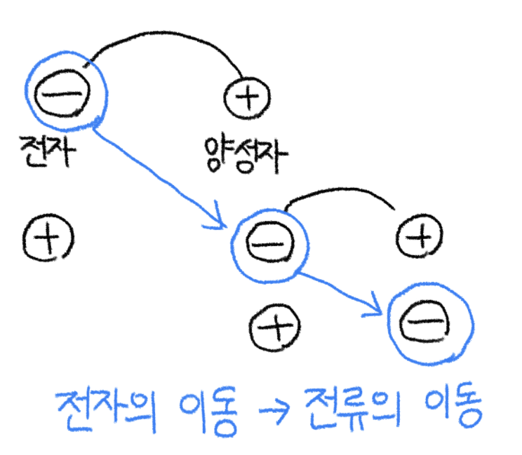 => 전자가 흐르면, 전류가 흐른다고 한다.전류는 전기선에서 흐르는데,