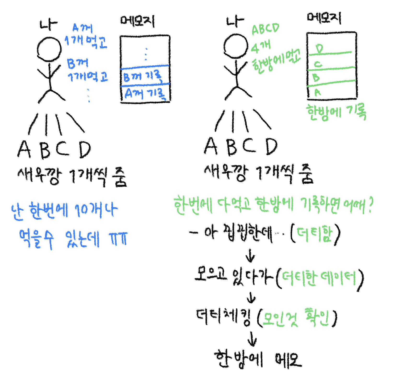 나는 그걸 먹고 메모지에 먹은 것을 기록(IO)해야한다.