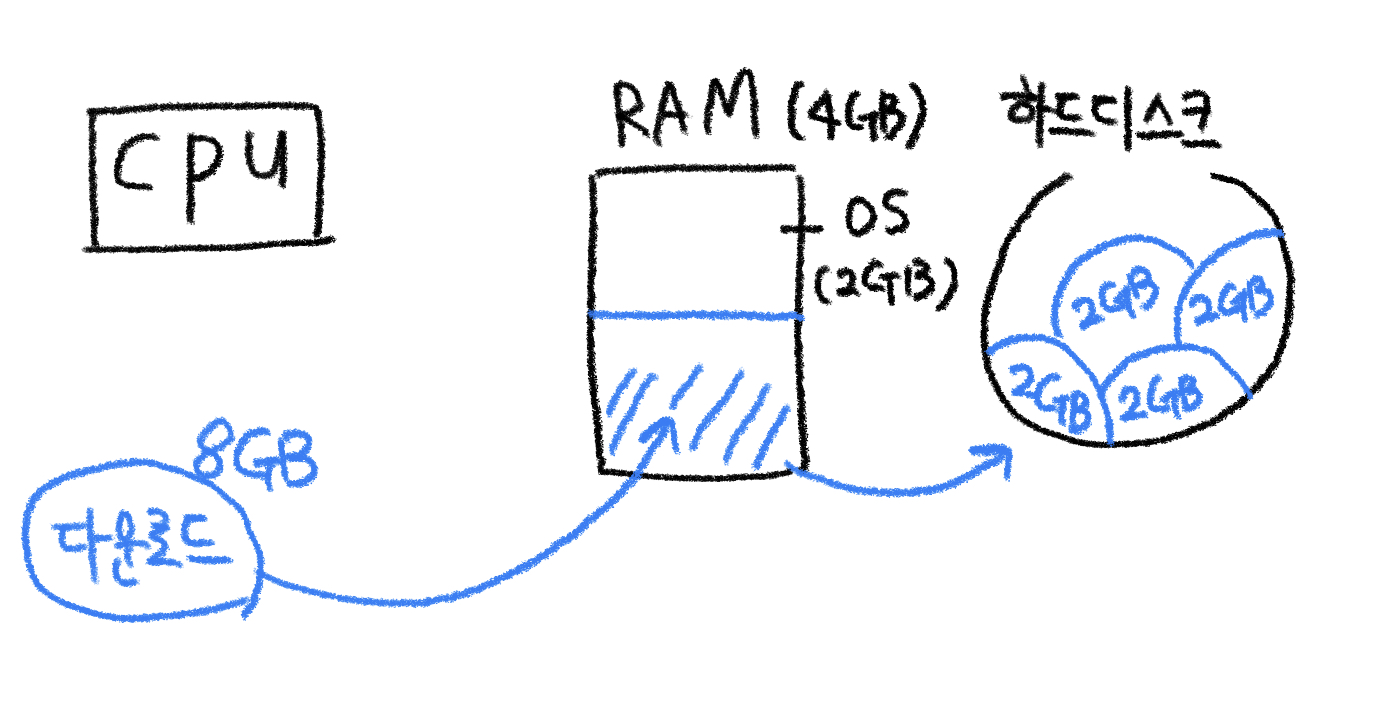 - 그래서 일단 2GB 받아서 하드에 저장 (IO), 램 비우고 다시 2GB 받아서 하드에 저장 (IO)