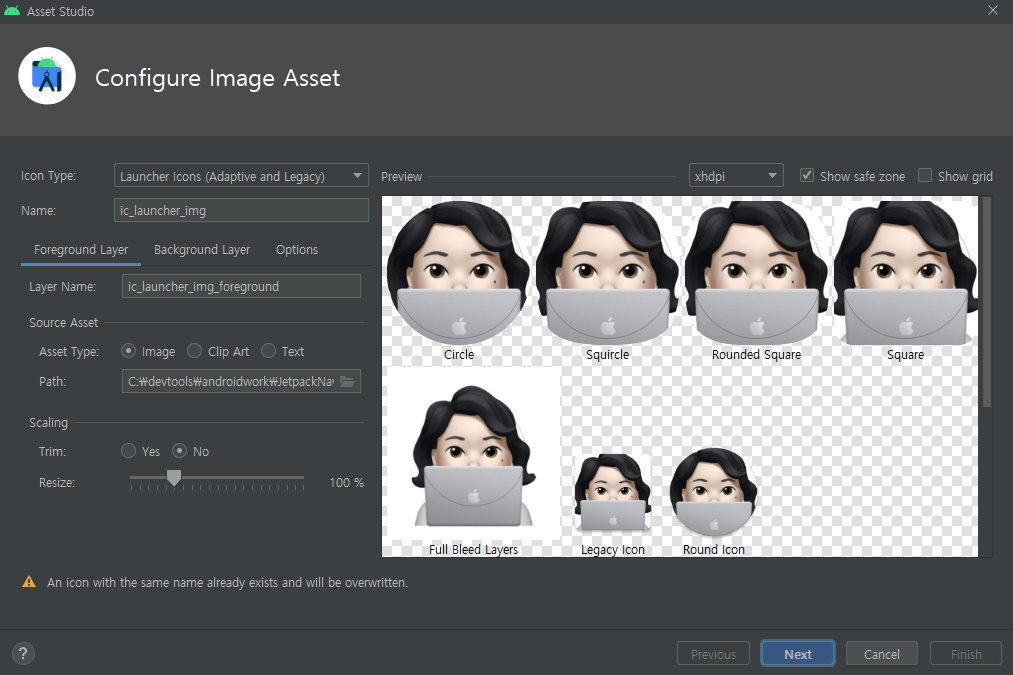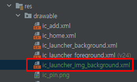 <?xml version="1.0" encoding="utf-8"?> <adaptive-icon xmlns:android="http://schemas.android.com/apk/res/android"> <background android:drawable="@color/ic_launcher_img_background"/> <foreground android:drawable="@mipmap/ic_launcher_img_foreground"/> </adaptive-icon>anydpi-v26 폴더에는 foreground, background 가 정의된 vector 리소스가 추가된다.