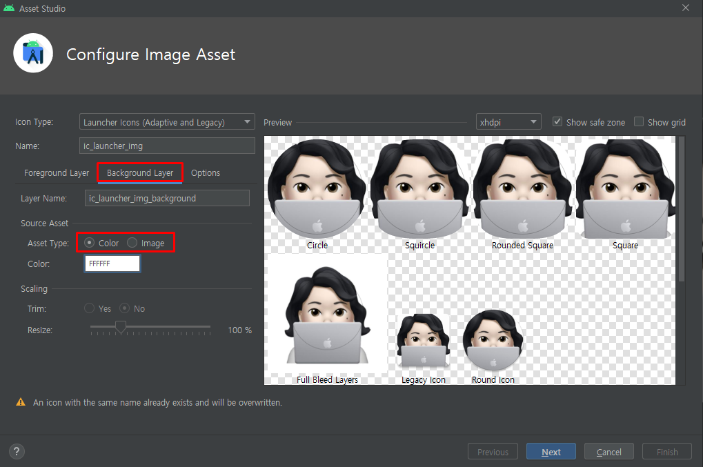 <?xml version="1.0" encoding="utf-8"?> <resources> <color name="ic_app_main_logo_background">#FFFFFF</color> </resources>이미지를 선택할 경우 drawable xml이 생성됨